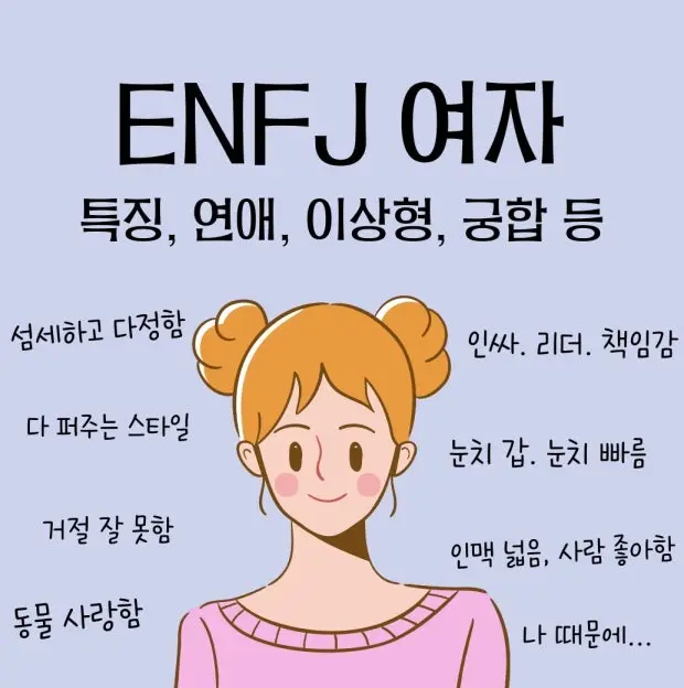 이번 기사에서는 ENFJ 여자가 연애할 때는 어떤 모습을 보일지, 또 어떤 유형과 가장 궁합이 좋을지 관련하여 ENFJ 여자 특징부터 ENFJ 여자 호감표현, 최강 조합까지 살펴보겠습니다.