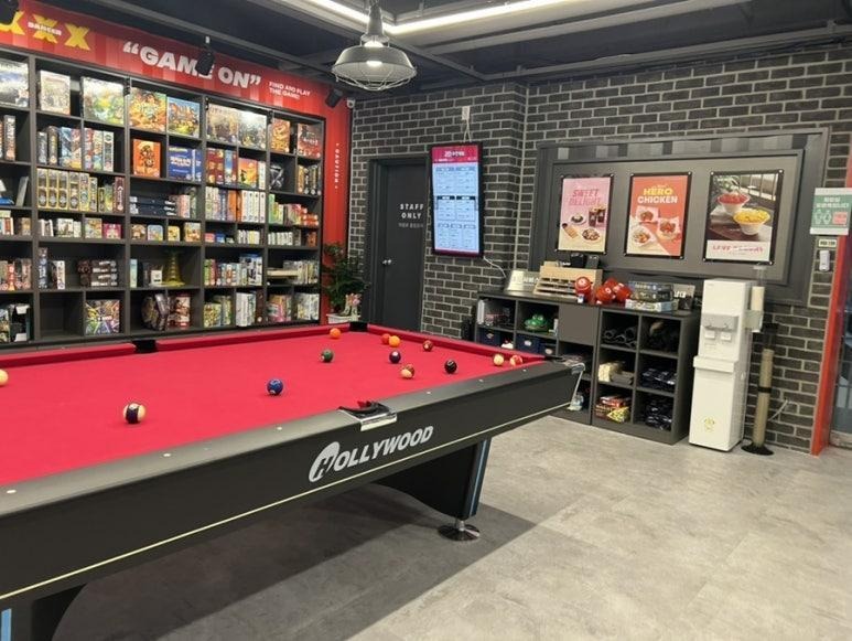매장 중앙이나 공용 공간에는 포켓볼 대, 다트 기계, 고전 오락기 등이 설치되어 있어 보드게임을 하다가 잠시 기분 전환을 하기에 좋습니다.
