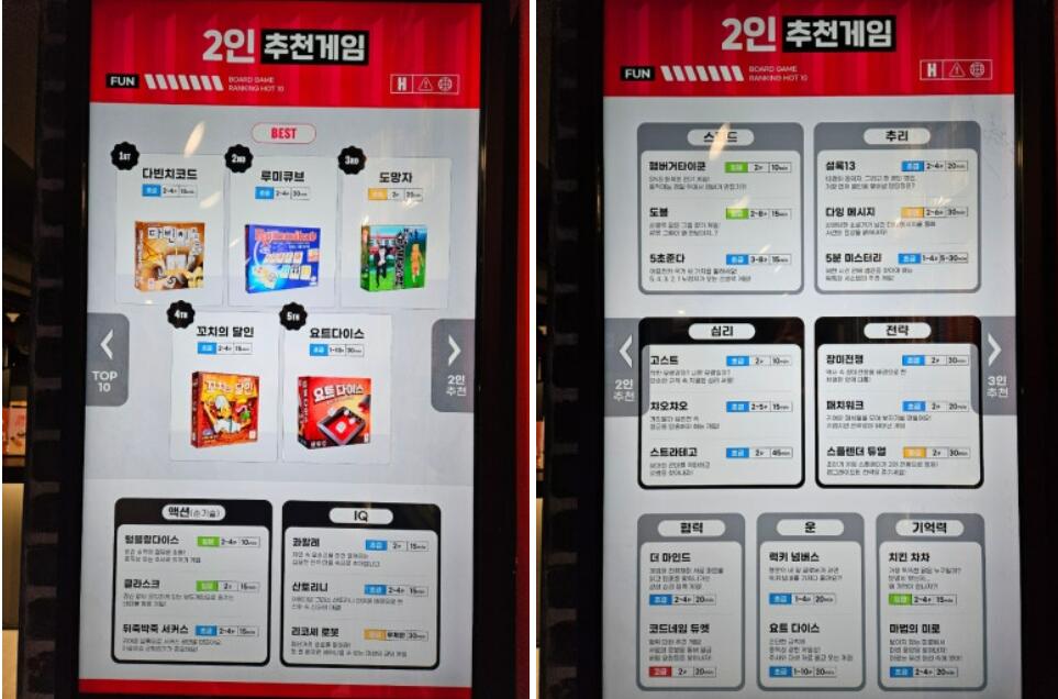 보드게임이 낯선 방문객들을 위해 매장에서는 테마별 추천 리스트를 제공합니다.